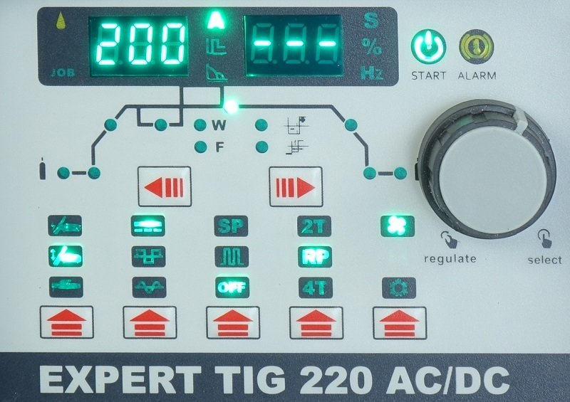 Auf der digitalen Anzeige können die folgenden Parameter eingestellt werden: Anfang- Schutzgasfluss, Anfang- Strom, Stromanstiegszeit, Basisstrom, Stromabfallzeit, Endstrom, End- Schutzgasfluss, Impulslänge, Impulsfrequenz, AC-Balance, AC-Frequenz, HOT START, ARC FORCE. Von der Ebene des Bedienfeldes ist es möglich, den Verlauf der Wechselspannungskurve auszuwählen: dreieckige, rechteckige oder sinusförmige Spannungskurve.