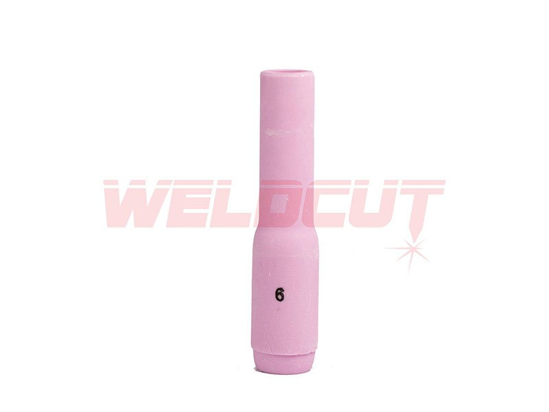 Die zu den WIG-Brennern der Typen WP17, WP18 und WP26 passende, lange Keramik-Gasdüse 10N48L | 701.0116. Die Düse ist der Größe #6 Ø9.5mm und ihre Länge beträgt 76 mm. Das Produkt wurde nach dem BINZEL-Standard hergestellt.