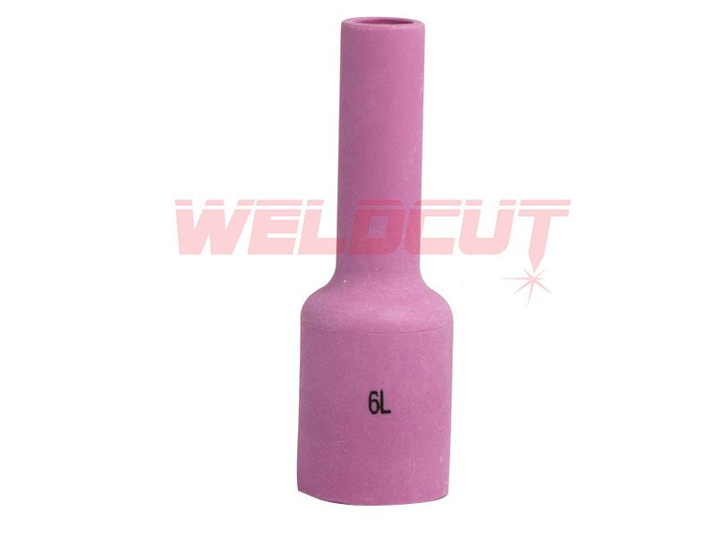 Die zu den WIG-Brennern der Typen WP17, WP18 und WP26 passende, lange Keramik-Gasdüse 54N16L / 701.0428. Die Düse ist der Größe #6 Ø9.5mm und ihre Länge beträgt 76 mm. Das Produkt wurde nach dem BINZEL-Standard hergestellt.