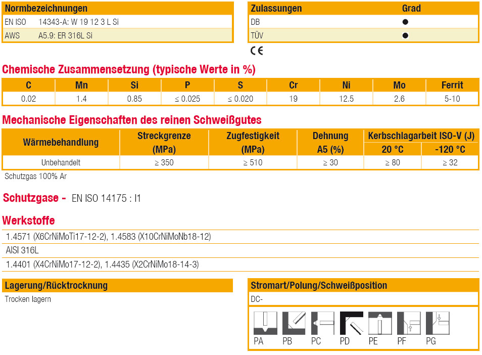 WIG-Schweißstab für artähnliche austenitische Cr-Ni-Mo-Stähle/-Stahlgusssorten. Unter Beachtung der Anforderungen auch einsetzbar für ferritische nichtrostende Cr-Stähle. Unter nasskorrosiven Bedingungen für Betriebstemperaturen bis 400 °C. Höherer Siliziumgehalt für besseres Anfließen und Nahtaussehen.