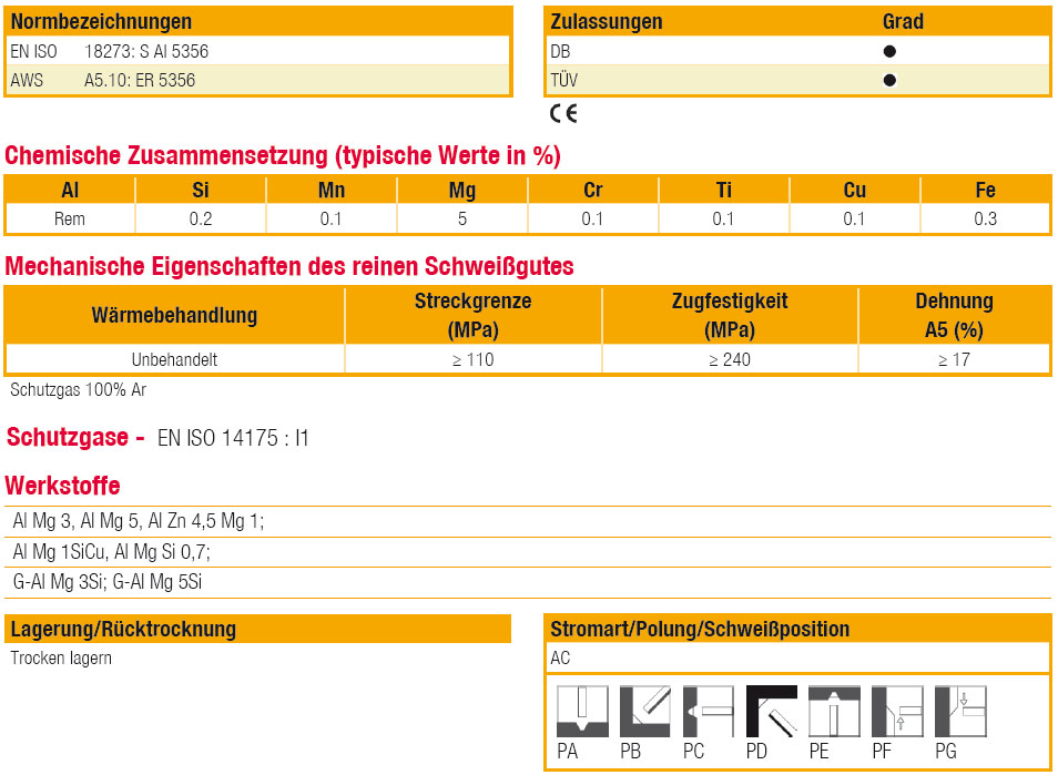 WIG-Schweißstab zum Schweißen von Al-Mg- und Al-Mg-Si-Legierungen. Das Schweißgut ist seewasserbeständig. Annähernde Farbgleichheit mit Grundwerkstoffen nach anodischer Oxidation (Eloxieren).