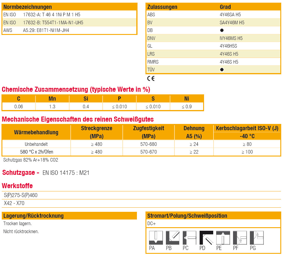 Nahtlose Fülldrahtelektrode mit rutiler schnell erstarrender Schlacke für das Metall - SchutzgasschweiBen von unlegierten Stählen für Einsatztemperaturen von - 40°C bis +450°C in allen SchweiBpositionen im Sprühlichtbogen mit erhöhten SchweiBparametern und erhöhten Abschmelzleistungen. Sehr gute Schlackenentfernbarkeit, glatte Nahtoberflächen mit kerbfreien Nahtübergängen. Sehr gute mechanische Gütewerte und hohe Röntgensicherheit. Manuell und vollmechanisiert, beispielsweise mit Orbital- oder Vertikalführungsgeräten, verarbeitbar. SchweiBen aller SchweiBpositionen mit einer Parameterkombination möglich! Sehr gut auf keramischer SchweiBbadsicherung zu verarbeiten. Als Schutzgas wird vorzugsweise Mischgas empfohlen. Die Verwendung von CO2 ist möglich.